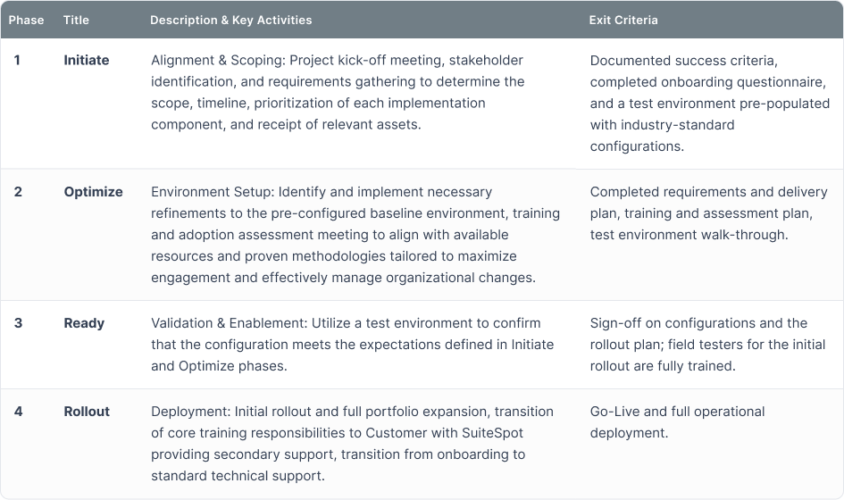 Unless otherwise set forth in an Order Form or SOW, SuiteSpot provides a standard onboarding package structured in four phases. Both Parties will use commercially reasonable efforts to achieve "Go-Live" (the date the Services are available for use in a live environment) on the mutually agreed upon timeline.