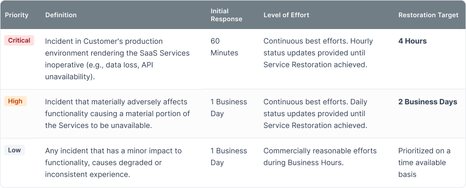 All incidents must be reported via the SuiteSpot ticketing portal or emailed to support@suitespot.ai. Response and restoration targets commence when SuiteSpot acknowledges receipt of a verifiable and reproducible error report from Customer.